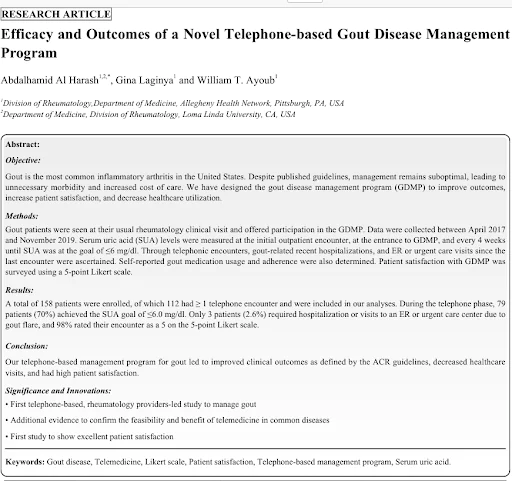 Al Harash, A., Laginya, G., & Ayoub, W. T. (2021). Efficacy and outcomes of a novel telephone-based gout disease management program. The Open Rheumatology Journal, 15(1), 51–56. https://doi.org/10.2174/1874312902115010051